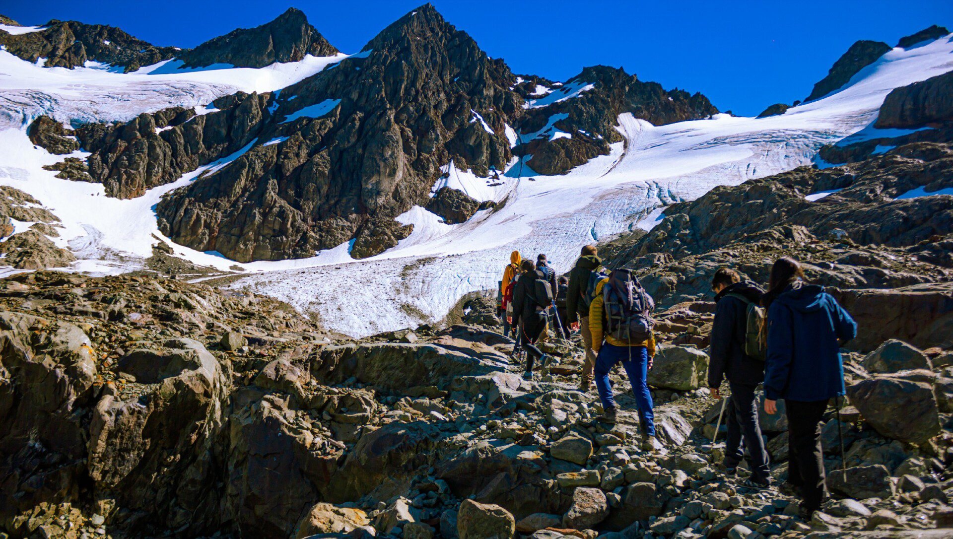 Ao chegarmos, colocaremos os equipamentos necessários para o percurso, grampones (se houver muito gelo e neve) e bastões.